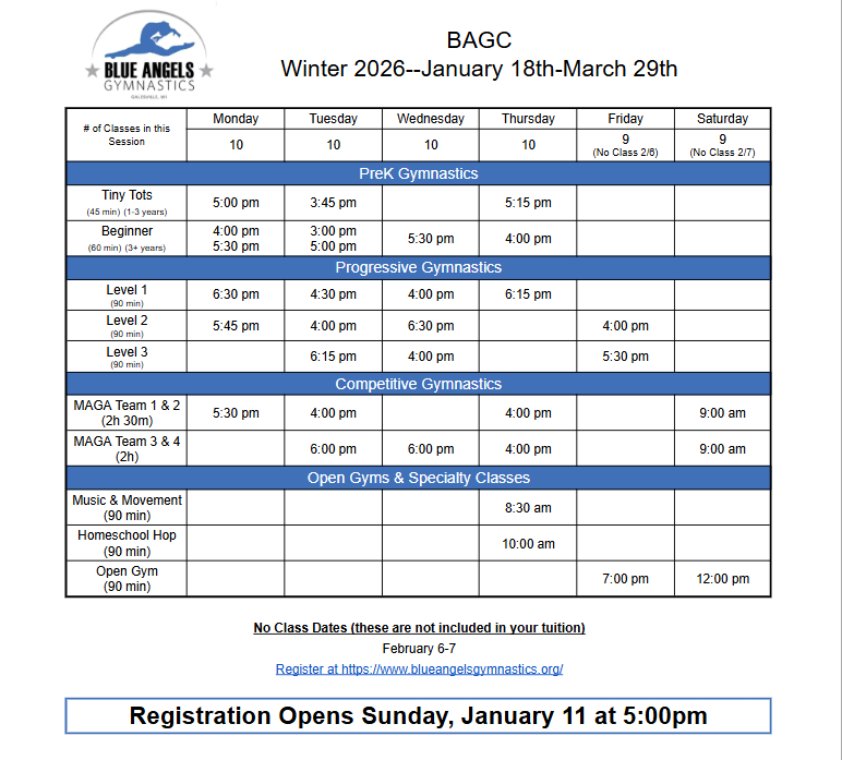 LOCATED ON THE CLASSES TAB @ https://blueangelsgymnastics.org/classes