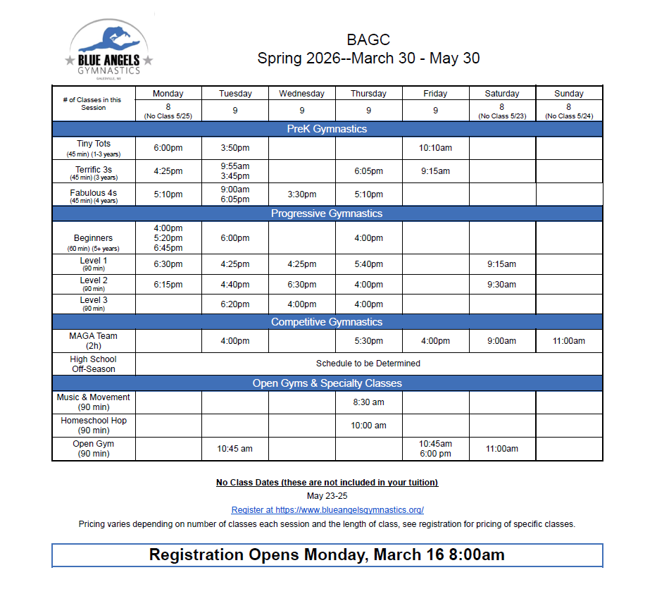 Blue Angels Gymnastics Club offers 10-week sessions, year round. Schedules change each session and registration opens 2 weeks prior to session start date, on Monday at 8:00am. Please note: many of our classes fill quickly - we recommend registering early to secure your spot!