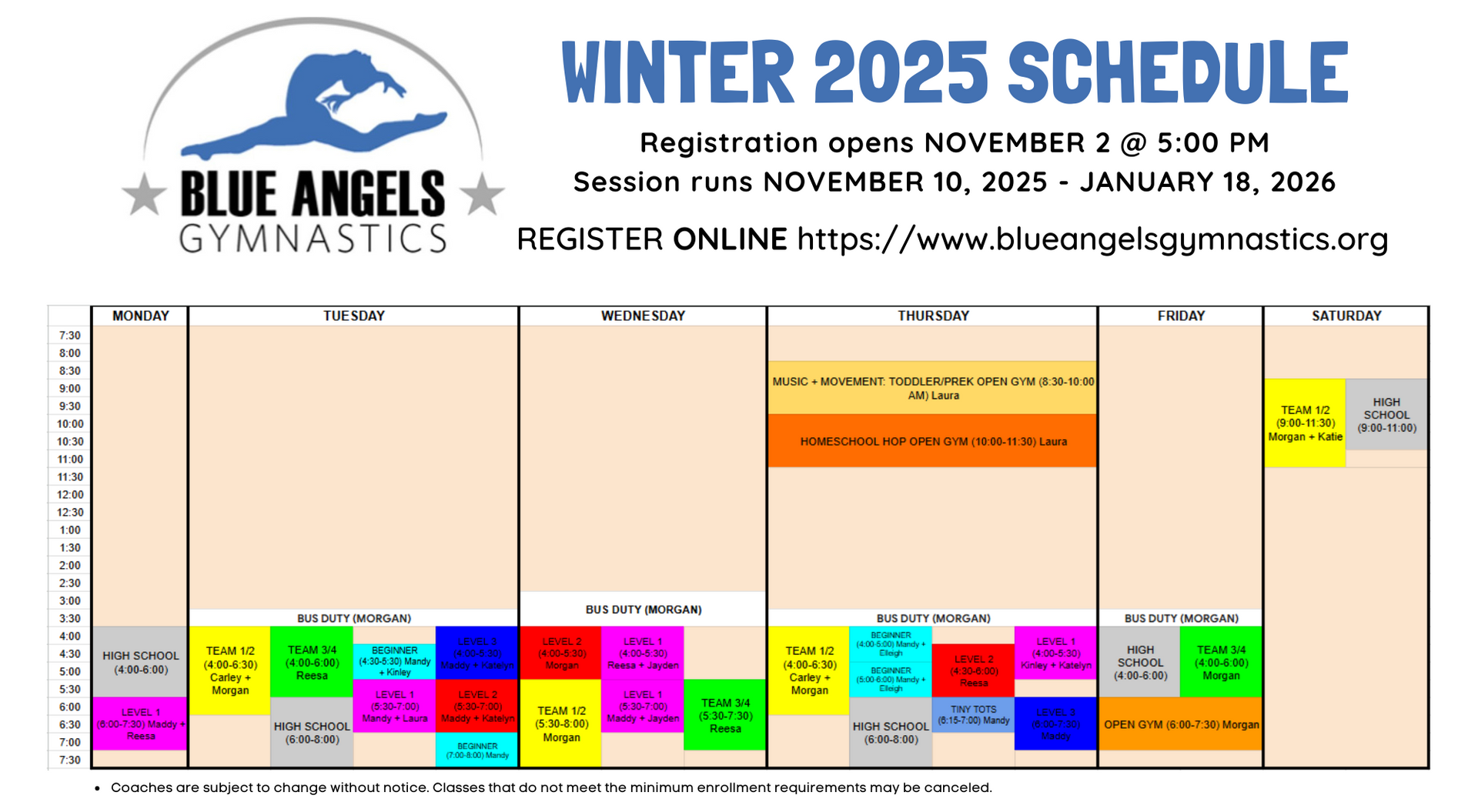 LOCATED ON THE CLASSES TAB @ https://blueangelsgymnastics.org/classes